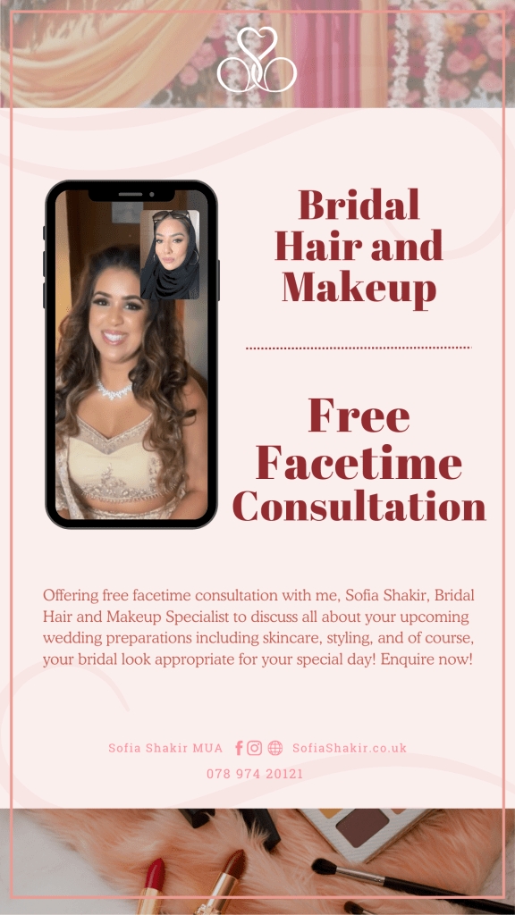Attention all brides-to-be! We have amazing news to share – Sofia Shakir, the bridal hair and makeup artist is now offering free consultation sessions through Facetime. This is the perfect chance for you to connect with our expert and discuss your ideal wedding day look.